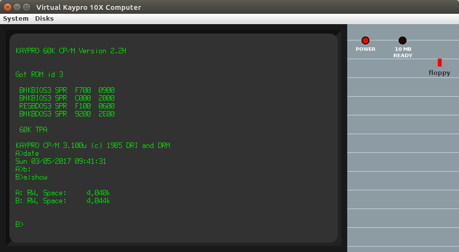 CAUTION: Running Kaypro-specific programs under this version of CP/M 3 can be risky. CP/M 3 does not use the ROM BIOS (in order to avoid the cost of the high memory being consumed by it), and so anything that calls the ROM while CP/M 3 is loaded and running may corrupt the high memory parts of CP/M 3. It is not known exactly which Kaypro programs call the ROM directly, but one suspicious one is MITE (MITE.COM, MINSTALL.COM, AUTOMITE.COM). Standard CP/M programs should be fine.