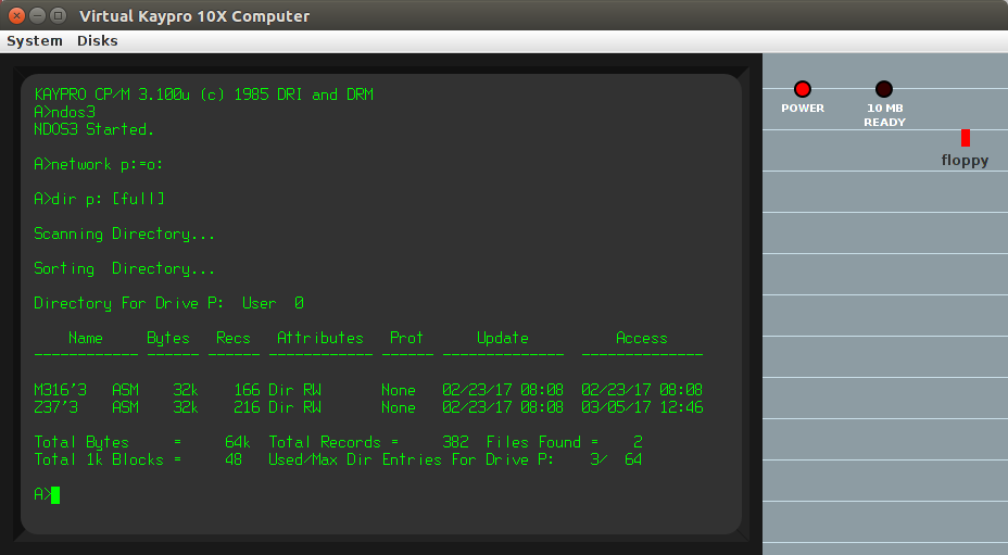 CP/NET is also working for CP/M 3. Use the same disk image "WD1002-0.cpm3" but config file "kaypro10u.cpnet" (example). Allows access to host files as placed in ~/HostFileBdos/* subdirectories ("*" is "a" thru "p"). Watch for line-endings, Linux uses only line-feed. The program "TR" may be used to copy file and translate line endings.