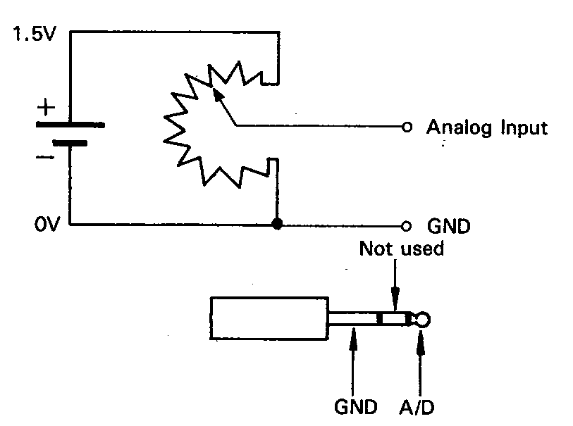 The circuit comprises a battery to provide the voltage, a variable resistor and the neccessary connecting wires. The connections to the A/D interface are shown in section 4. 6.